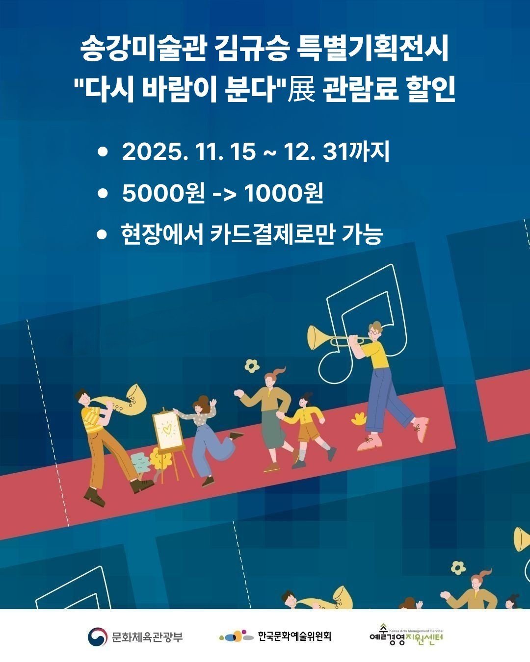 송강미술관은 예술경영지원센터와 문화체육관광부한국문화예술위원회가 진행하는 ‘2025미술전시 관람료 현장 할인 지원’사업에 참여해 2025년 11월 15일부터 12월 31일까지 2025 송강미술관 김규승 특별기획전시회 “다시 바람이 분다”의 기간 한정 특별 관람료 할인 행사를 운영하고 있다