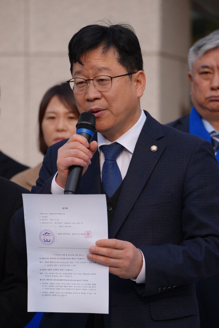 [국회의정저널] 안호영 국회 기후에너지환경노동위원장을 비롯한 더불어민주당 김문수·윤종군·이재강 의원은 11월 24일 오전, 서울 서초구 대법원 앞에서 김용 전 민주연구원 부원장 사건의 조속한 선고를 촉구하는 기자회견을 열고 촉구의견서를 제출했다.