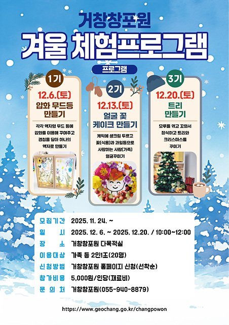 표정애 환경과장은 "이번 프로그램은 가족들과 함께 거창창포원에서 특별한 겨울추억을 만들 소중한 기회가 되길 바란다"며 많은 참여를 당부했다.