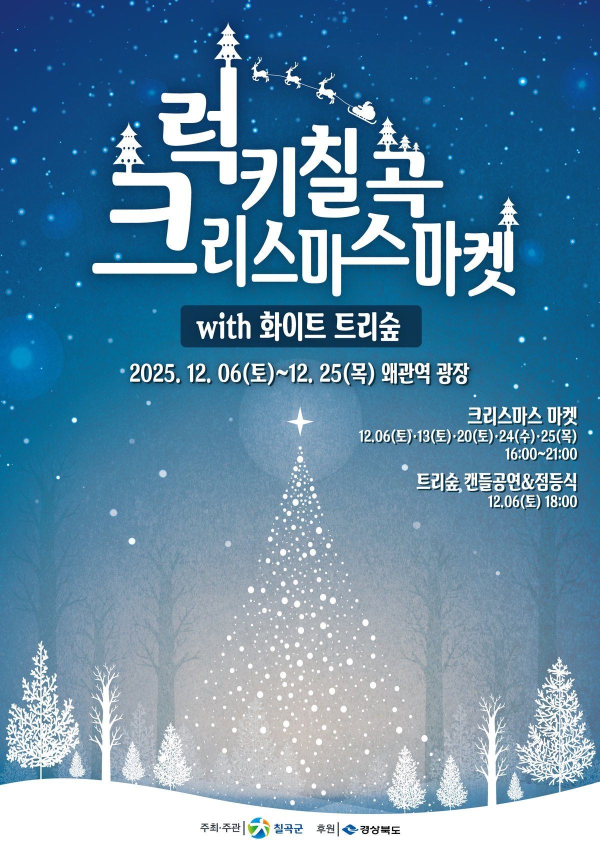 겨울축제가 없는 칠곡에서 연말연시를 따뜻하고 환하게 밝혀줄 겨울철 신규 관광콘텐츠로 기획된 럭키칠곡 크리스마스 마켓은 ‘with 화이트 트리숲’을 부제로 12. 6. / 12. 13. / 12. 20. / 12. 24. / 12. 25. 총 5회에 걸쳐 오후 4시부터 오후 9시까지 운영한다.
