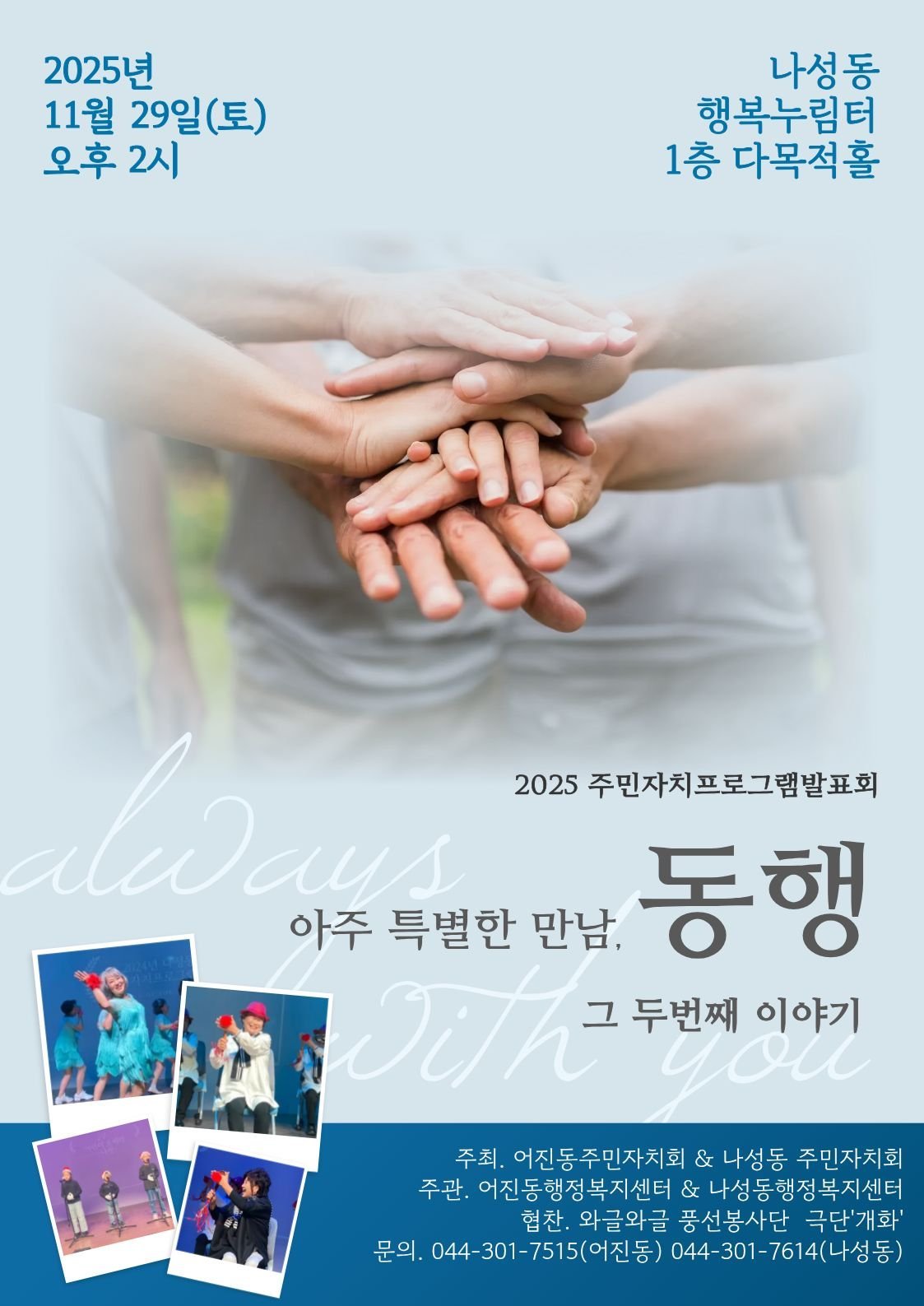 [국회의정저널] 세종특별자치시 어진동·나성동 주민자치회가 29일 오후 2시 나성동 행복누림터 1층 다목적홀에서 주민자치프로그램 연합 발표회를 개최한다.
