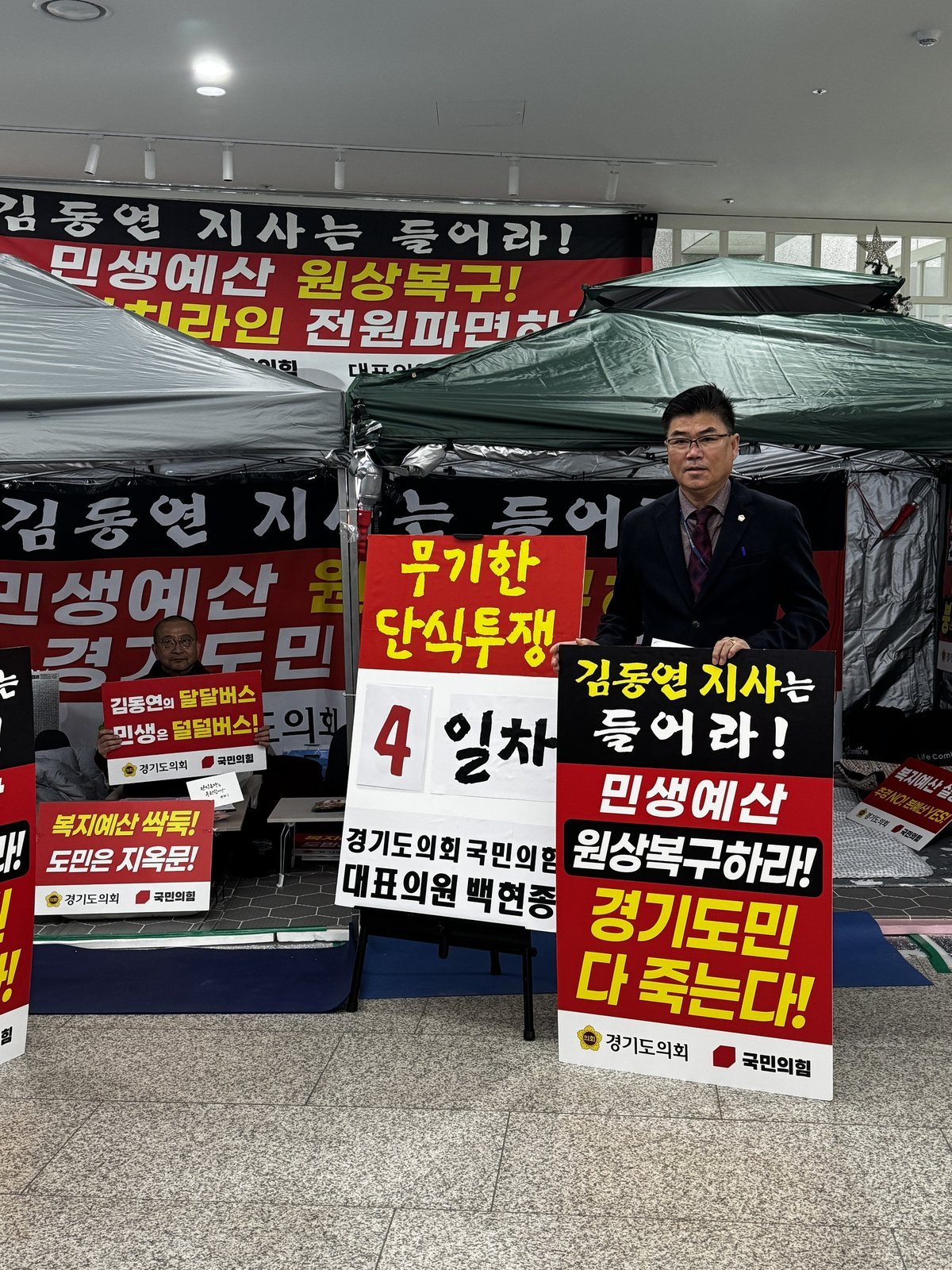 [국회의정저널] 경기도의회 보건복지위원회 윤태길 의원은 11월 28일 도의회 1층 로비를 찾아, 김동연 지사의 민생예산 대규모 삭감에 맞서 단식 투쟁 중인 백현종 국민의힘 대표의 1인 시위를 지지하며 연대 의지를 밝혔다.