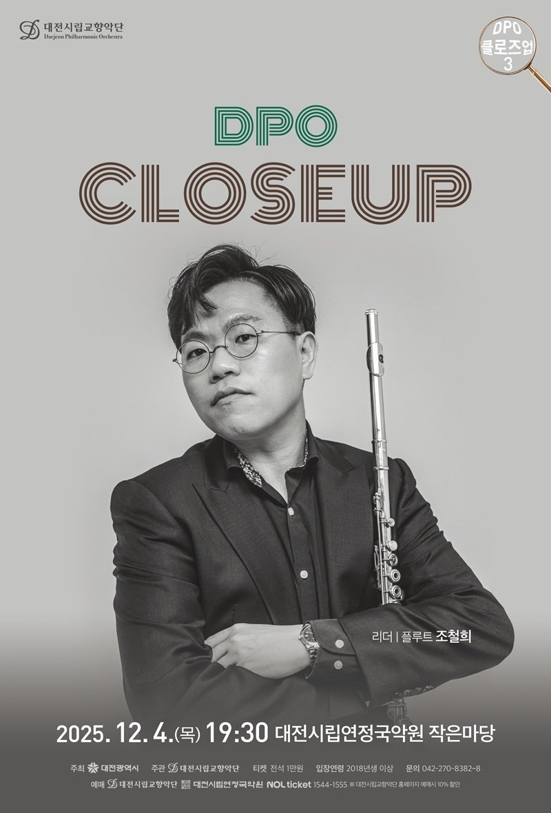 ‘DPO 클로즈업’은 대전시향 단원이 리더로 참여하여 연주와 해설을 맡아 관객들과 보다 가까이에서 소통할 수 있도록 기획한 연주회로 올해 마지막 클로즈업 무대는 플루트 수석 조철희가 리더를 맡아 ‘섬세하고 유려한 플루트’를 주제로 관객들과 교감한다.