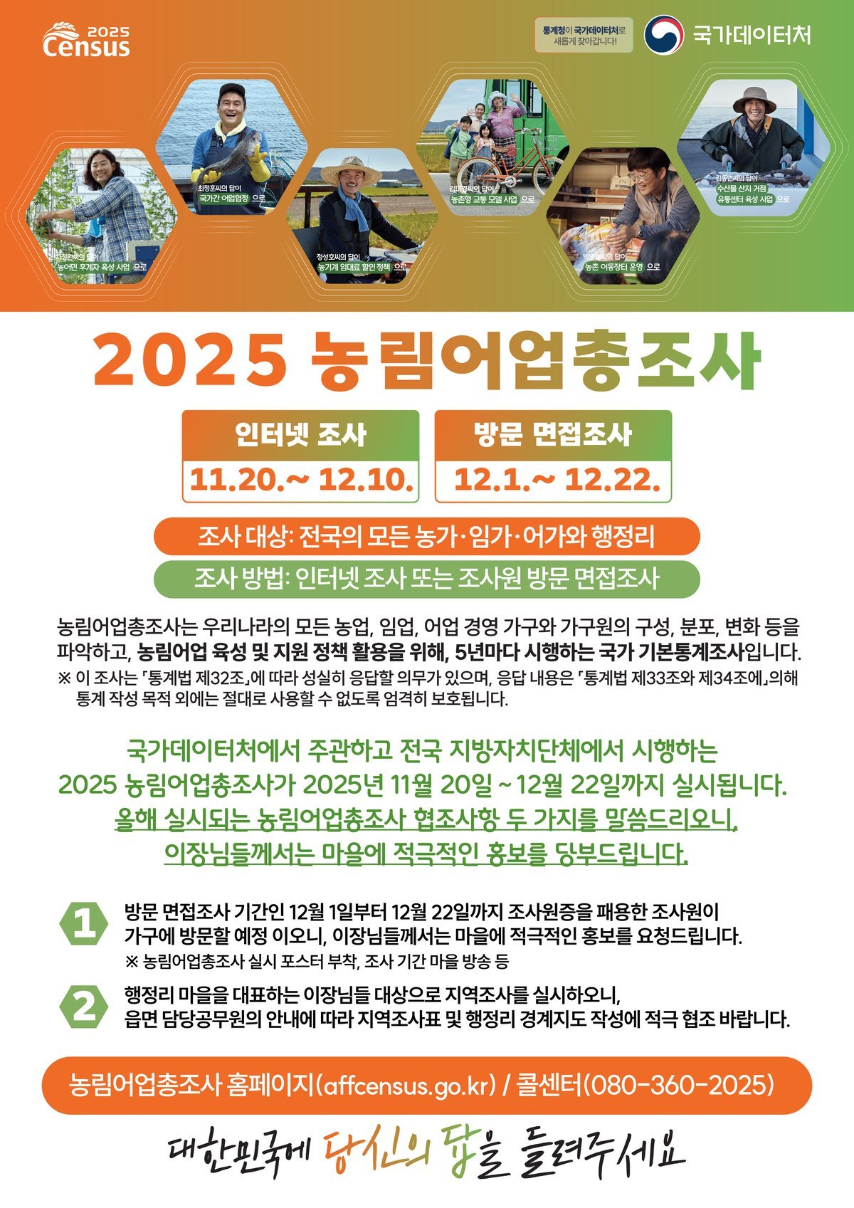 조사 대상은 관내 모든 농가, 임가, 어가와 행정리를 대상으로 실시되며, 국가데이터처에서 11월 중순에 발송한 안내문을 받은 1만1350여 가구를 조사한다.