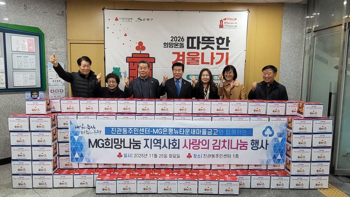 양정민 진관동장은 “관내 어려움을 겪는 가정에 꼭 필요한 도움을 주신 은평뉴타운새마을금고 이사장님과 관계자분께 깊이 감사드리며 기부해 주신 김치는 관내 저소득 가구에 잘 전달하겠다”며 “이번 기부가 주민들의 겨울철 건강한 식생활을 지원하는 데 큰 힘이 될 것으로 기대된다”고 전했다.