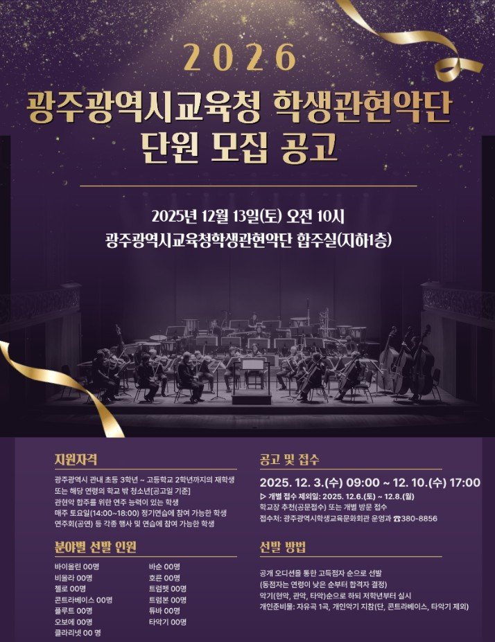 [국회의정저널] 광주시교육청학생교육문화회관은 ‘2026 광주광역시교육청 학생관현악단’신규 단원을 모집한다.
