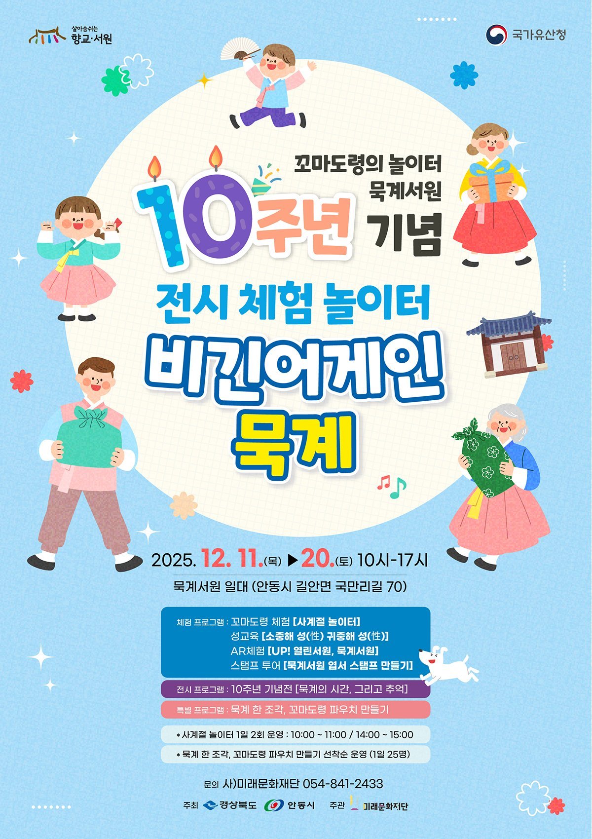 안동시와 미래문화재단 관계자는 “2016년 어린이 대상 국가유산 활용사업으로 시작된 「꼬마도령의 놀이터 묵계서원」은 전통 공간인 서원이 열린 문화공간으로 확장되는 과정에 큰 역할을 해왔다”며 “10주년을 맞은 이번 프로그램이 어린이와 가족들에게 특별한 추억이 되고, 앞으로의 10년을 향한 새로운 출발점이 되기를 바란다”고 말했다.
