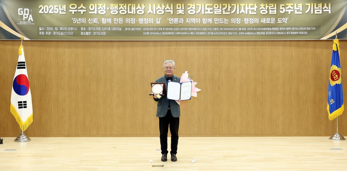 [국회의정저널] 경기도의회 문화체육관광위원회 홍원길 의원이 10일 경기도일간기자단이 주관한 ‘2025년 우수 의정ㆍ행정대상’시상식에서 경기도의회 그랜드마스터상을 수상했다.