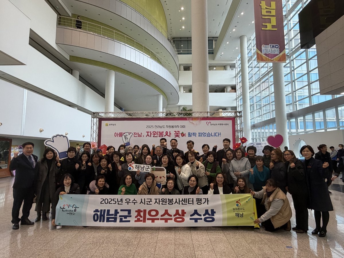[국회의정저널] 해남군이 10일 전남도청에서 열린 2025 자원봉사자 대회에서 2년 연속 최우수 자원봉사센터로 선정되어 최우수상을 수상했다.