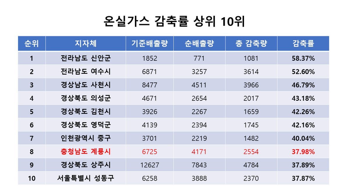 계룡시는 이번 공공부문 온실가스 감축률 부문에서 전체 지방자치단체 중 8위를 달성하며 기후변화 대응 정책과 에너지 절감 노력의 모범사례로 주목받고 있다.