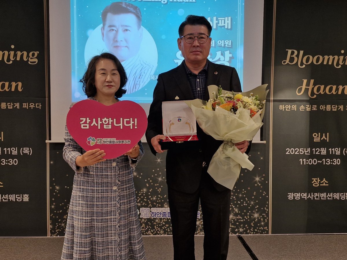 유종상 의원은 11일 광명역사컨벤션웨딩홀에서 열린 ‘2025년 하안종합사회복지관 자원봉사자 및 후원자 감사의 날’행사에서 하안종합사회복지관으로부터 감사패를 수상했다.