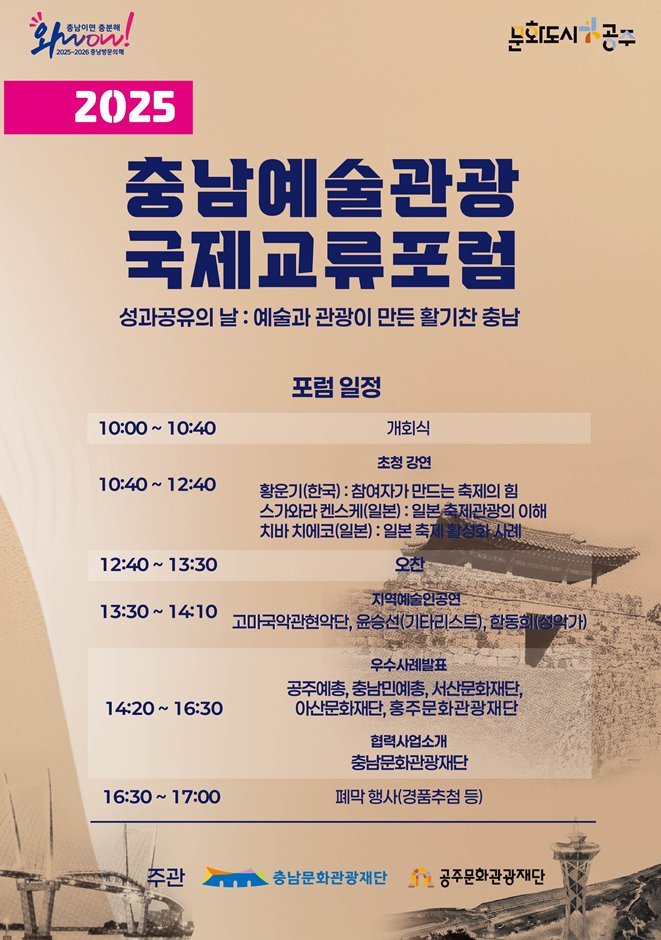 [국회의정저널] 충남문화관광재단은 공주문화관광재단과 공동으로 12일 오전 10시, 충남에서 활동하는 예술인과 관광 실무자, 국내외 전문가들이 함께하는 ‘2025 충남 예술관광 국제교류 포럼’을 개최한다고 밝혔다.