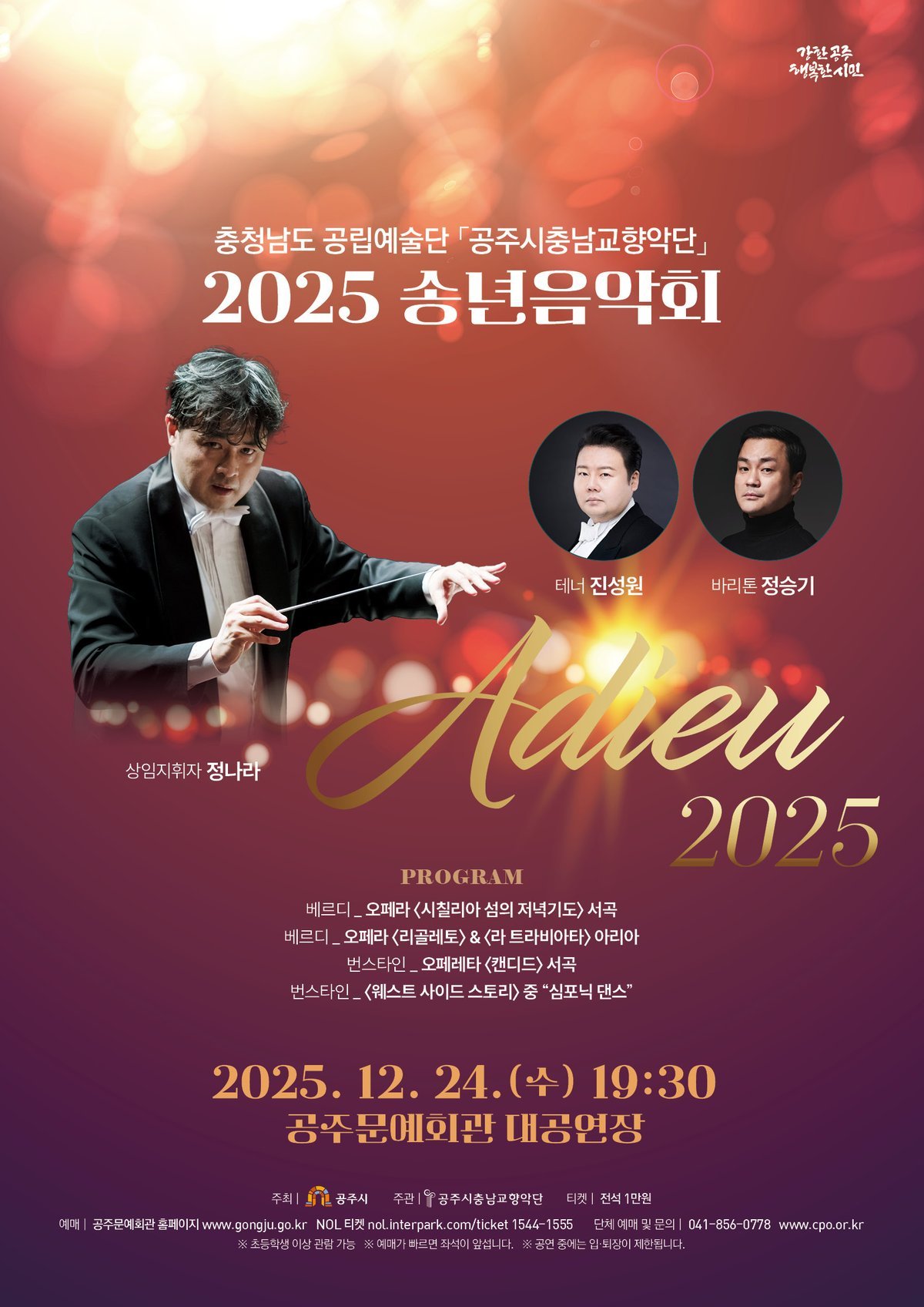 [국회의정저널] 충청남도 공립예술단인 공주시충남교향악단은 다사다난했던 2025년을 마무리하며 성탄의 기쁨과 송구영신의 마음을 담은 송년음악회 ‘Adieu 2025’를 오는 12월 24일 오후 7시 30분 공주문예회관 대공연장에서 개최한다고 밝혔다.