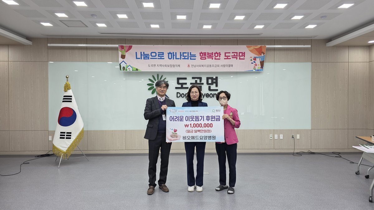 [국회의정저널] 도곡면 지역사회보장협의체는 지난 11일 관내 소재한 비오메드요양병원이 ‘사랑의 바자회’를 통해 마련한 수익금 100만 원을 도곡면 지역사회보장협의체에 기부했다고 밝혔다.