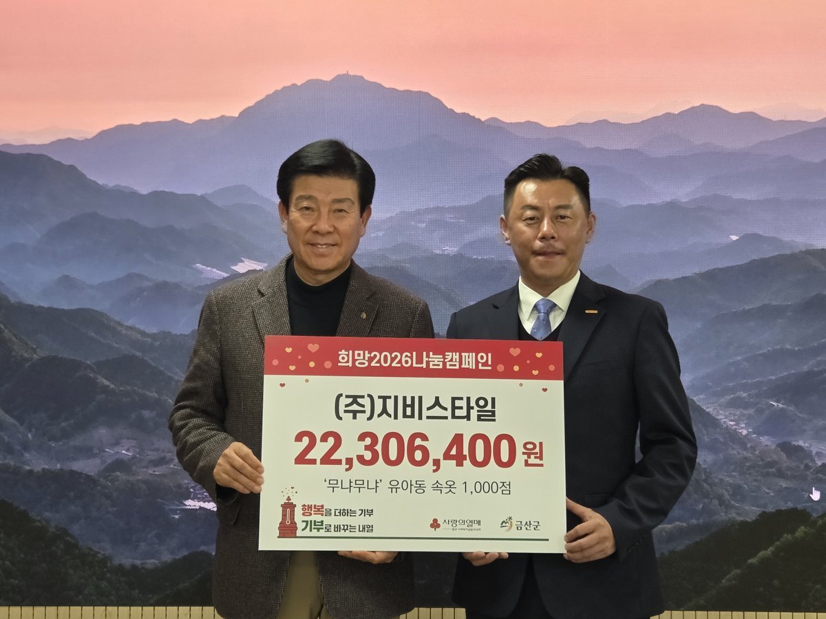 [국회의정저널] 유아동 의류 전문 브랜드 ㈜지비스타일은 지난 11일 금산군청을 방문해 약 2230만 원 상당 유아동 내의 1000점을 기탁하며 지역 아동을 위한 따뜻한 나눔을 실천했다.