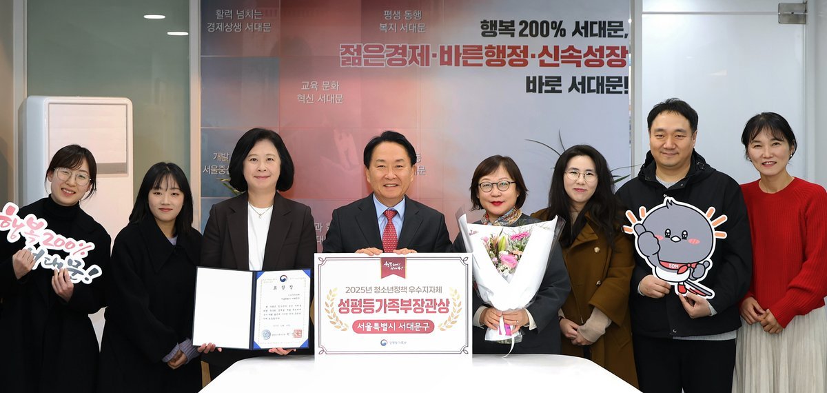 서대문구가 ‘2025년 청소년정책 우수 지자체’로 선정돼 성평등가족부 장관 표창을 수상한 가운데 이성헌 구청장과 관계 부서 직원들이 기념 촬영을 하고 있다.