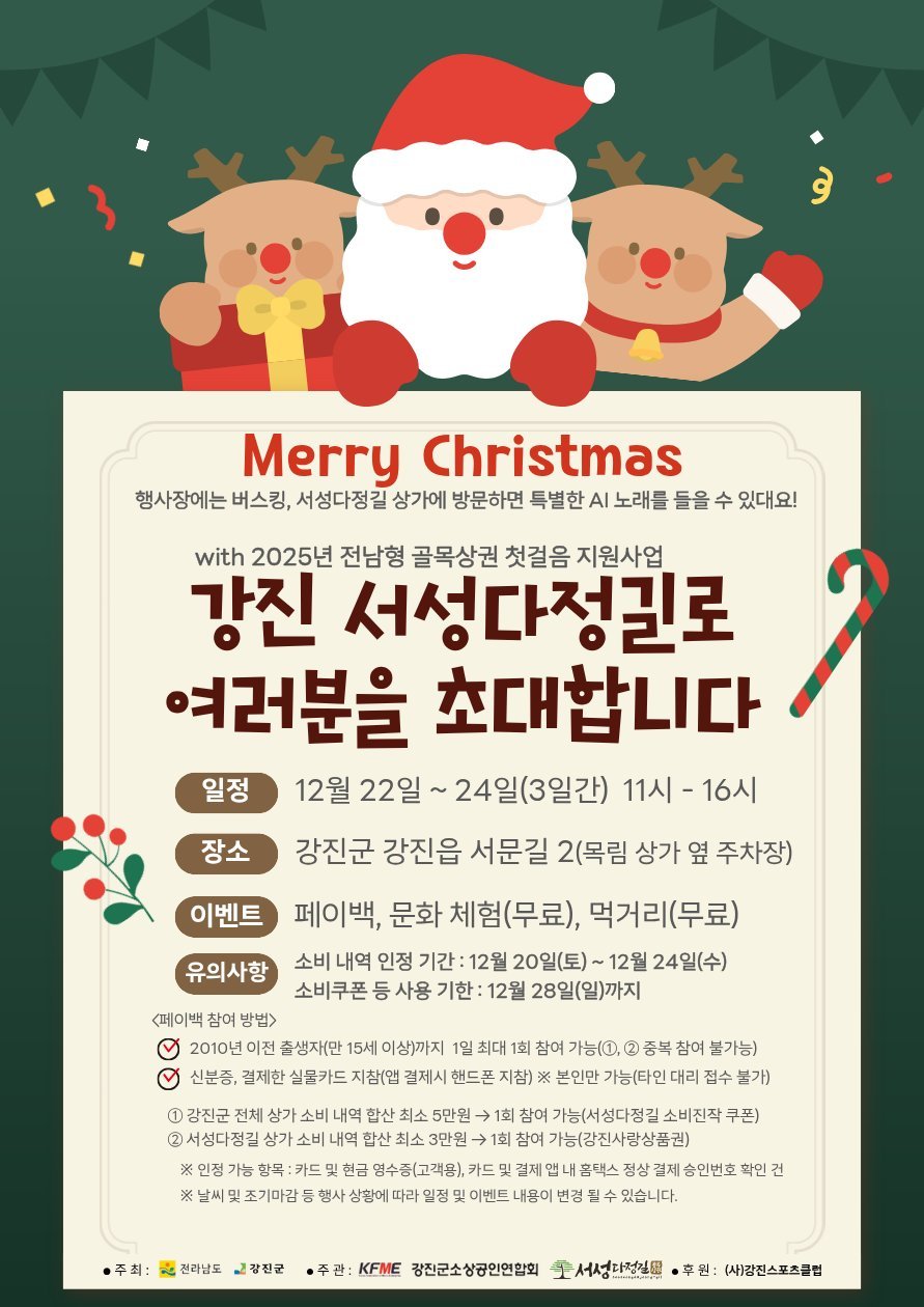 [국회의정저널] 강진군이 오는 22일부터 24일까지 3일간 서성다정길 골목형상점가 구역 일대에서 연말 분위기를 가득 담은 크리스마스 특별행사를 개최한다.