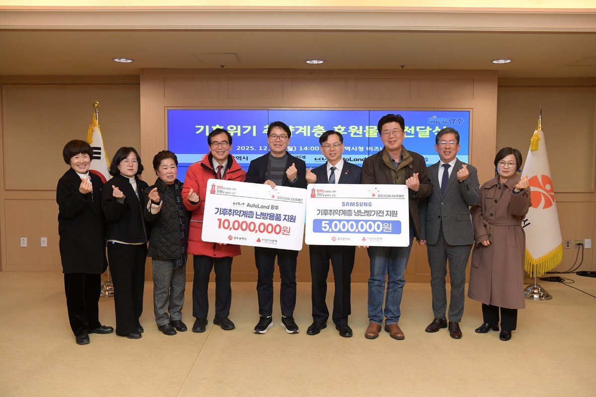 광주광역시는 15일 시청 비즈니스룸에서 기아오토랜드 광주, 삼성전자, 사회복지공동모금회 광주지회와 함께 기후위기 취약게층 지원을 위한 ‘기부물품 전달식’을 가졌다.