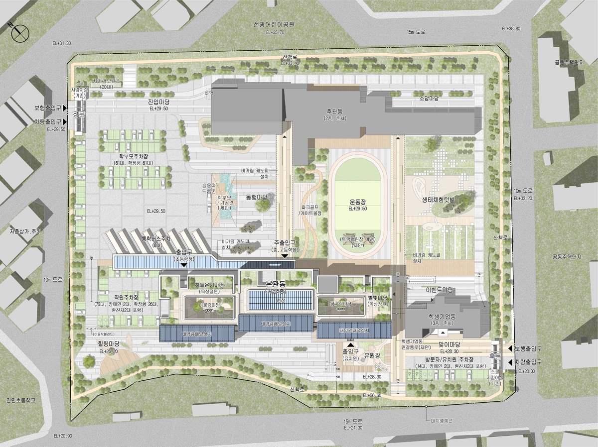 특히 건물 사이에 작은 정원을 조성해 경관과 휴식공간으로서 기능을 할 수 있도록 하고, 주차영역과 학생활동 공간을 합리적으로 나눠 호평을 받았다.