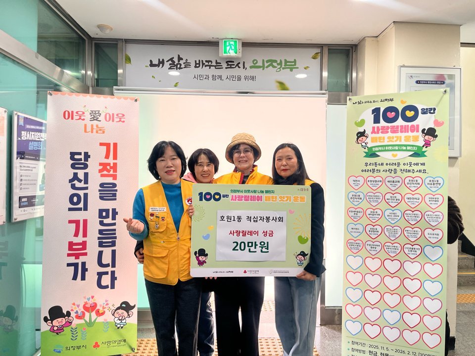 [국회의정저널] 의정부시 호원1동주민센터는 12월 11일 호원1동 적십자봉사회가 성금 20만 원을 기부하며 ‘100일간 사랑릴레이 배턴 잇기’에 동참했다고 밝혔다.