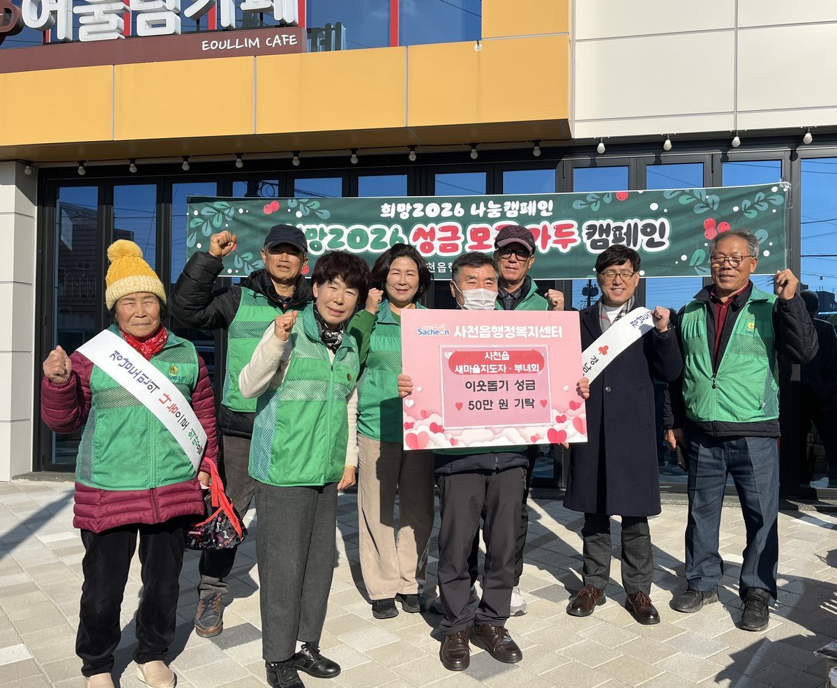 한편, 사천읍 새마을회는 이웃돕기 성금 전달뿐 아니라 환경정화 활동, 사랑의 밑반찬 봉사, 김장 나눔 행사 등 다양한 지역 봉사활동을 꾸준히 펼치며 지역사회 나눔 문화 확산에 기여하고 있다.