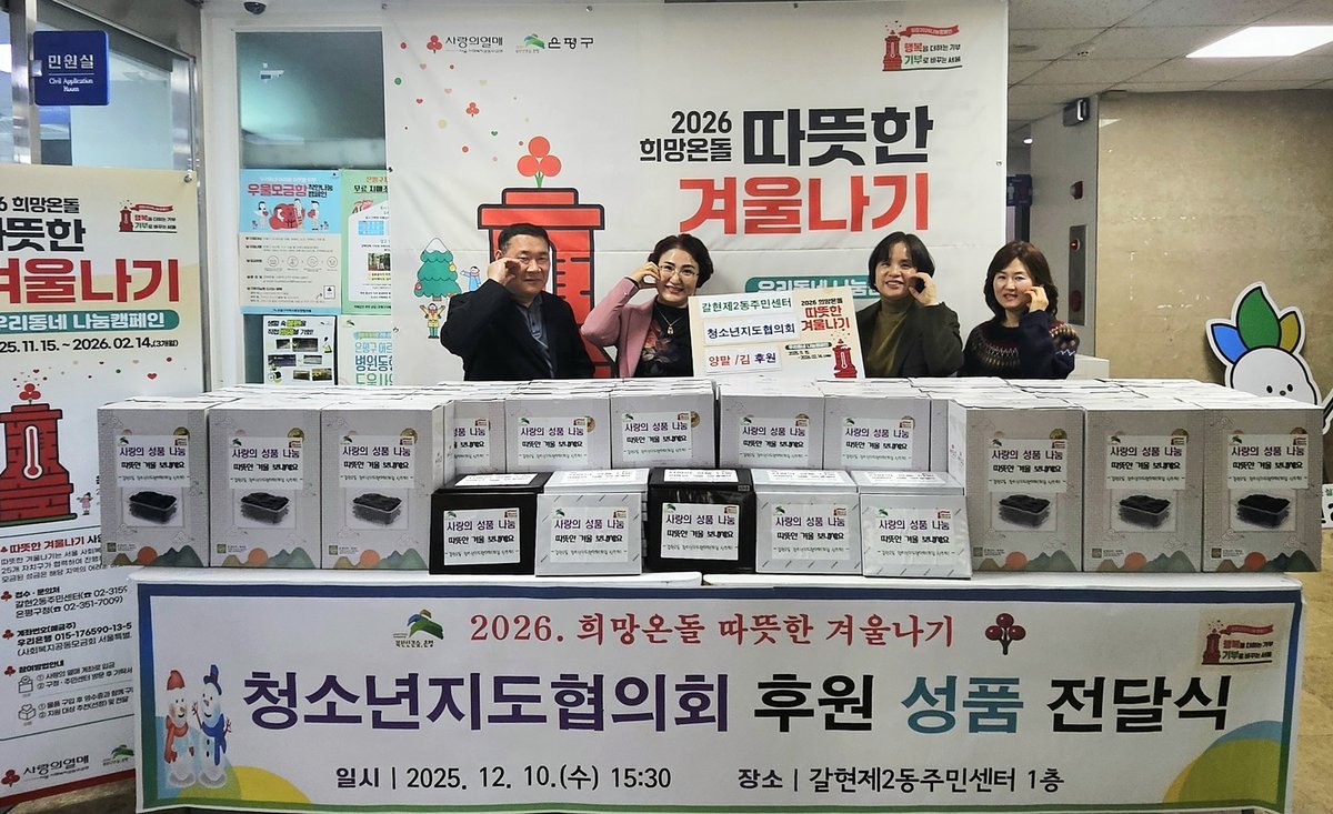 [국회의정저널] 서울 은평구 갈현2동은 지난 10일 청소년지도협의회 신주희 회장으로부터 ‘2026년 따뜻한 겨울나기 사랑의 성품’으로 김 50상자와 양말 50켤레를 전달받았다고 밝혔다.