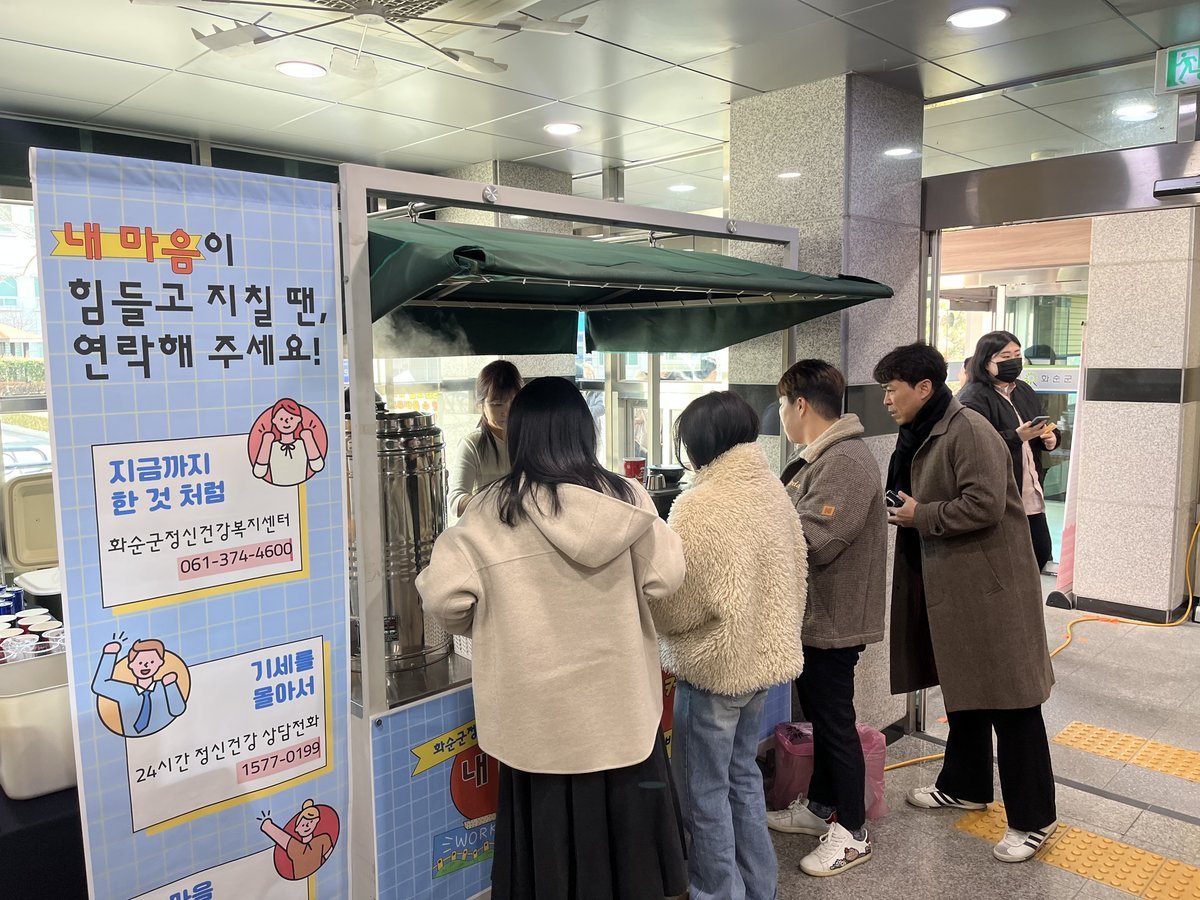 이에 화순군정신건강복지센터에서는 화순군청 직원 200여 명을 대상으로 화순군 청사 내에 ‘찾아가는 마음카페’를 설치하고, 우울증 선별검사와 함께 정신건강 서비스 정보 안내 이벤트를 진행했다.