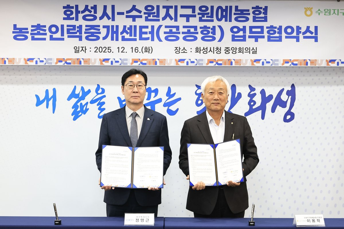 이날 시청 중앙회의실에서 열린 협약식에는 정명근 화성특례시장, 이용학 수원지구원예농협 조합장 등이 참석해, 공공형 농촌인력중개센터 운영 전반에 대해 긴밀히 협력하기로 했다.