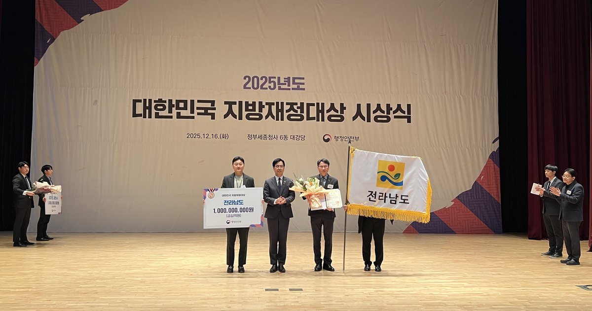[국회의정저널] 전라남도는 16일 정부세종청사에서 열린 행정안전부의 2025년 제18회 대한민국 지방재정대상 시상식에서 ‘통합재정운영평가’ 분야 대상을 받아, 재정인센티브 10억 원을 확보했다고 밝혔다.