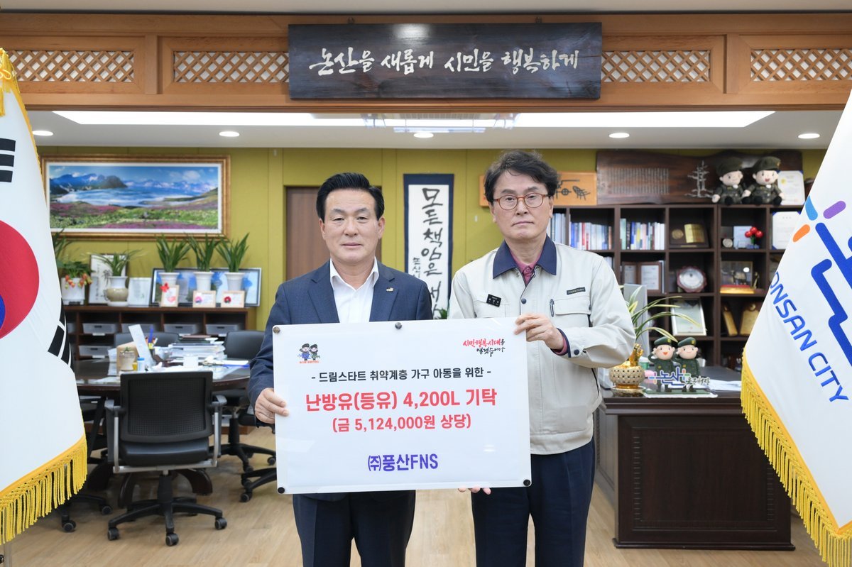 [국회의정저널] 논산시는 15일 국방산업 전문기업 ㈜풍산FNS가 저소득 아동들을 위해 약 500만 원 상당의 등유 4200리터를 기탁했다고 밝혔다.