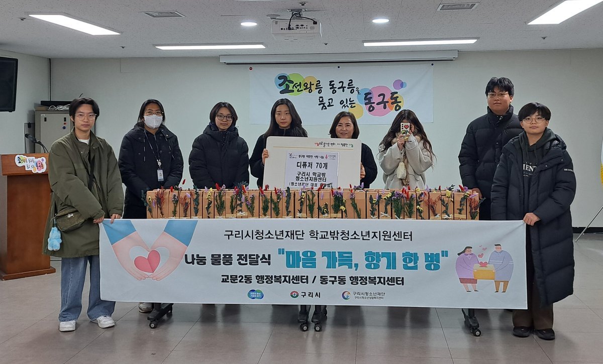 [국회의정저널] 구리시청소년재단 학교밖청소년지원센터는 지난 12월 15일 학교 밖 청소년들과 함께 교문2동 행정복지센터를 방문해 지역 내 홀몸 어르신들을 위해 디퓨저 100개를 전달했다.