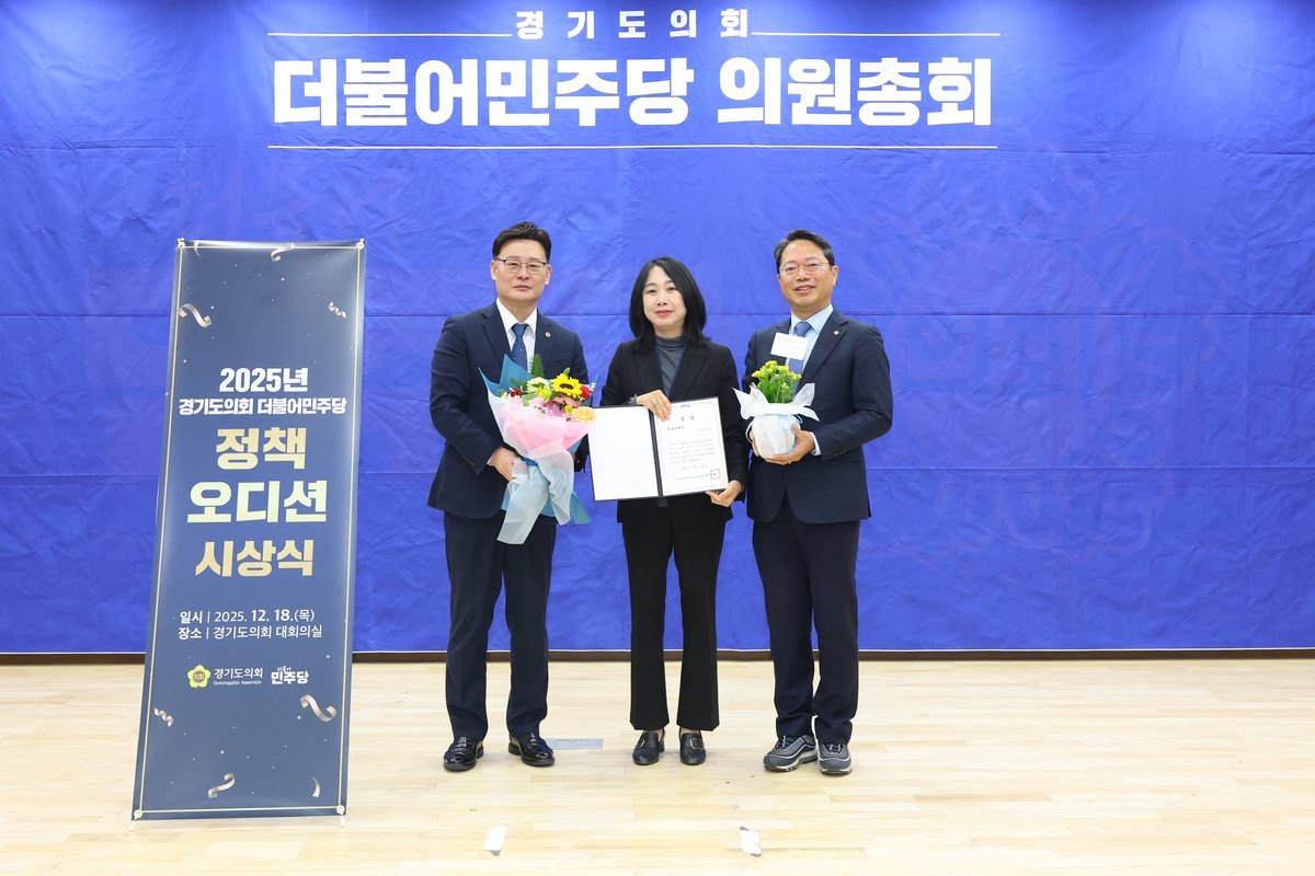 [국회의정저널] 경기도의회 경제노동위원회 이병숙 의원은 12월 18일 오전 도의회 대회의실에서 열린 「2025년 경기도의회 더불어민주당 정책오디션」에서 ‘경기도 여름 수변문화공원 어린이 문화예술 체험 활성화 방안’으로 대표의원상을 수상했다.