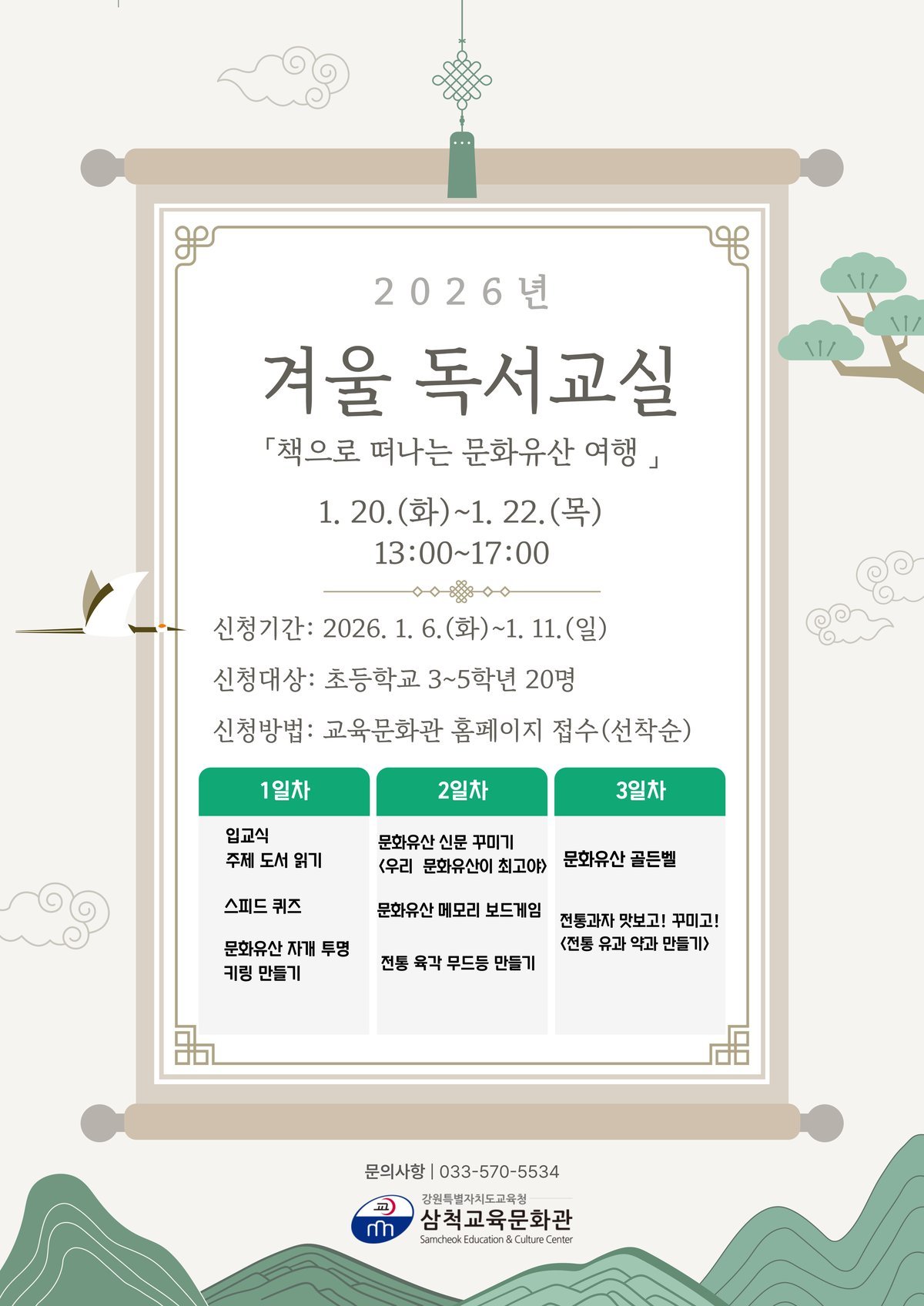 [국회의정저널] 삼척교육문화관은 1월 20일부터 1월 22일까지 초등3~5학년을 대상으로 ‘2026년 겨울 독서교실: 책으로 떠나는 문화유산 여행’을 운영한다고 밝혔다.