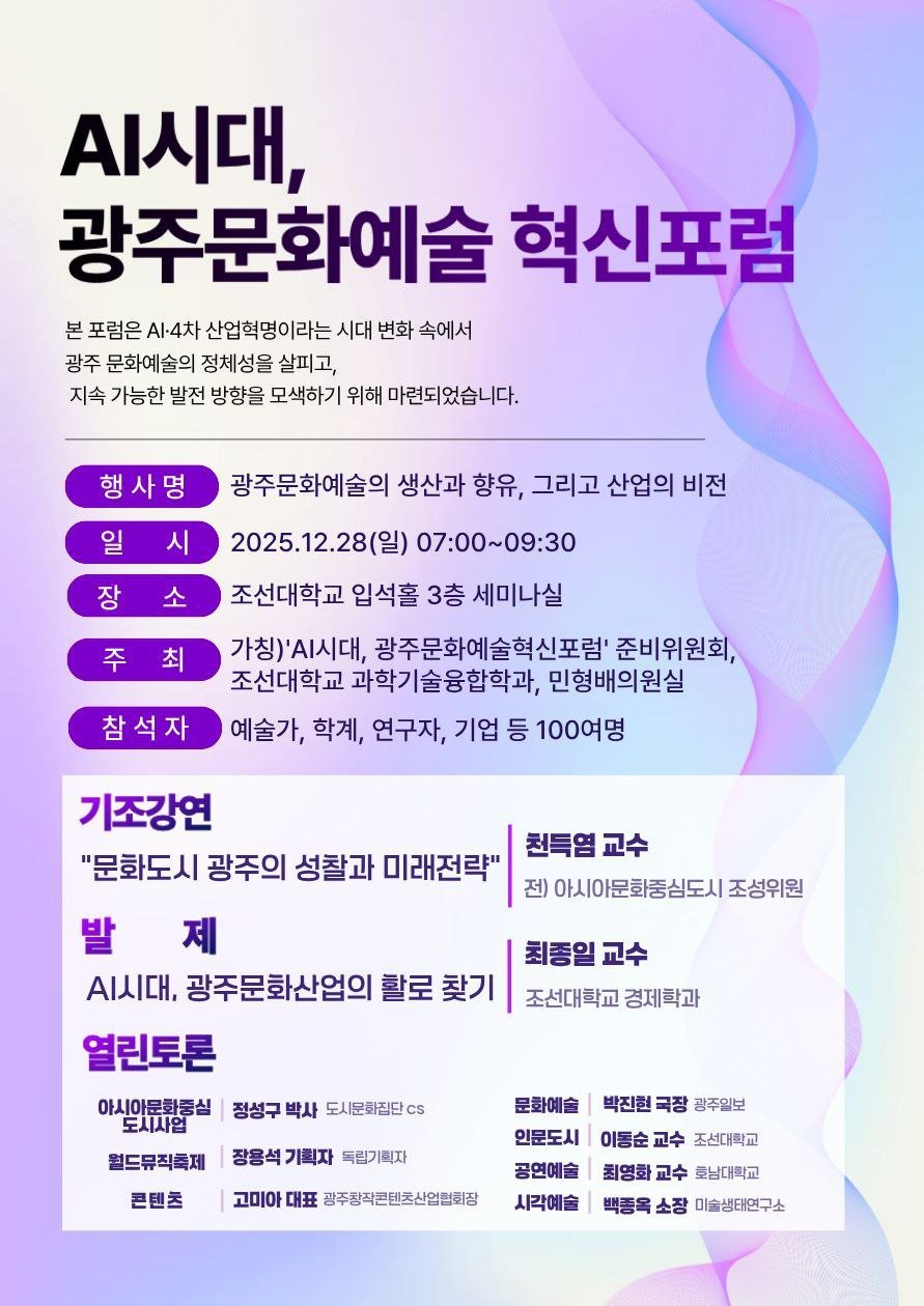 이어 최종일 조선대 경제학과 교수가 ‘AI 시대, 광주문화산업의 활로 찾기’를 주제로 발제한다.