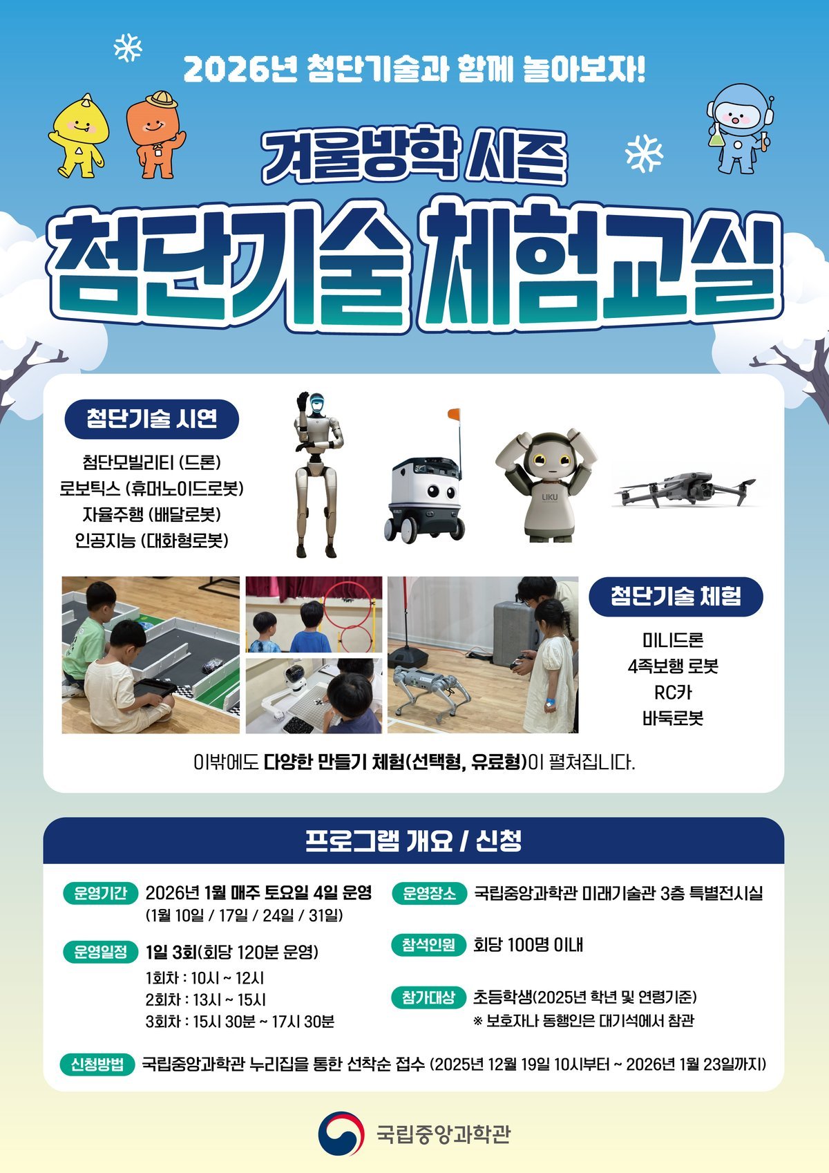 [국회의정저널] 국립중앙과학관은 겨울방학을 맞이하여 2026년 1월 중 매주 토요일 4일 동안「겨울방학 시즌 첨단기술 체험 교실」을 국립중앙과학관 미래 기술관 3층에서 운영한다고 밝혔다.