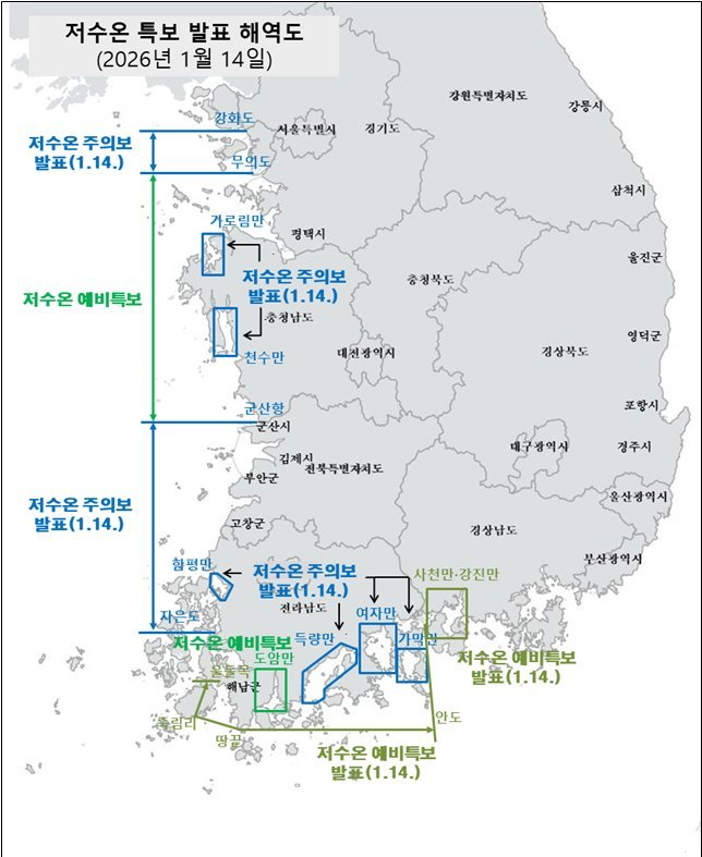 [국회의정저널] 해양수산부는 1월 14일 12시부로 저수온 위기경보* ‘경계’ 단계를 발령하였다고 밝혔다.