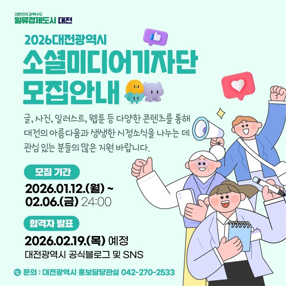 [국회의정저널] 대전시는 참신한 아이디어와 열정을 가지고 꿀잼도시 대전의 매력을 알릴‘2026 대전광역시 소셜미디어기자단’및‘2026 대전광역시 글로벌 서포터즈’를 모집한다.